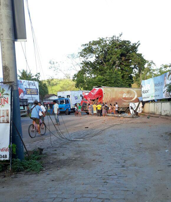 Após chegar no local, a equipe foi informada que uma carreta perdeu o controle, bateu em um poste que caiu, e derrubou parte de um muro, deixando o motorista preso em meio as ferragens do veículo.