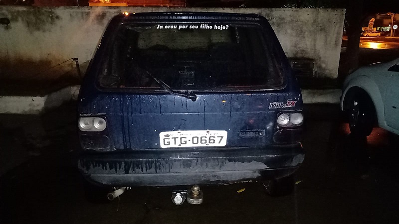 A guarnição da PM constatou que o automóvel estava sem capô e bateria, nem estepe. As chaves não estavam no Uno, que foi bem danificado.